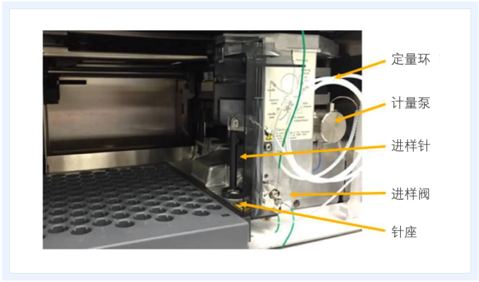 自動進(jìn)樣器是現(xiàn)代高效液相色譜系統(tǒng)四大基本模塊中另一個需要格外重視的高頻維護(hù)模塊。隨著現(xiàn)代液相色譜的發(fā)展,液相色譜儀器也已發(fā)展得越來越精密,其中的自動進(jìn)樣器也已越來越成為復(fù)雜精密的設(shè)備。當(dāng)自動進(jìn)樣器中的部件出現(xiàn)老化、磨損、泄露等問題時,可能會成為某些色譜問題的根源。下圖是常用的Agilent液相色譜系統(tǒng)自動進(jìn)樣器組成。