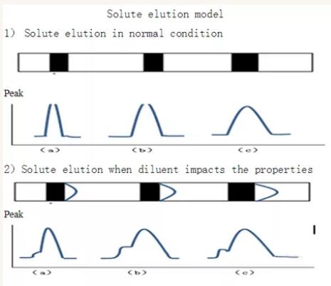 當(dāng)進(jìn)樣體積較小時(shí),擴(kuò)散至流動(dòng)相中的溶質(zhì)占大多數(shù),且擴(kuò)散在很短時(shí)間內(nèi)完成,因此峰形與用流動(dòng)相直接溶解樣品無(wú)大差異。隨著進(jìn)樣的體積增大,留在溶劑本身里的溶質(zhì)的量逐漸增大,當(dāng)進(jìn)樣體積增大到一定數(shù)量,留在溶劑里的溶質(zhì)的量變得不可忽略,在色譜圖上就表現(xiàn)為色譜峰的分叉、拖尾等。