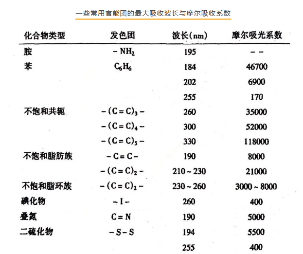 一些常用官能團(tuán)的更大吸收波長(zhǎng)與摩爾吸收系數(shù)
