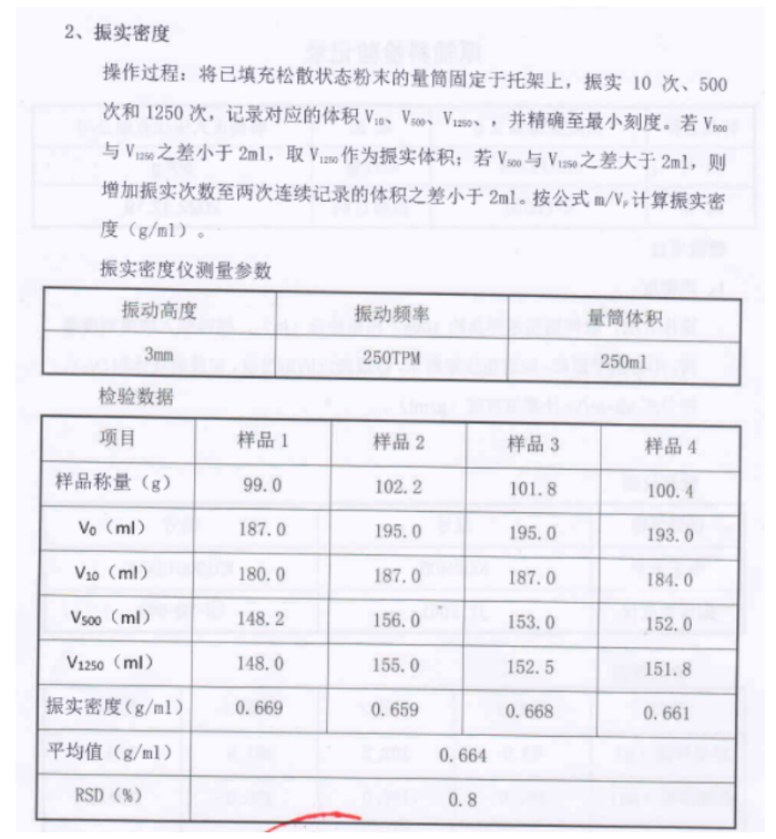 振實(shí)密度測試實(shí)拍圖 數(shù)據(jù)處理 更后,我們來看下數(shù)據(jù)處理界面,其中左側(cè)涉及樣品稱量,V0(表觀體積),Vf(V1250振實(shí)體積),右側(cè)涉及振動次數(shù)、堆密度、振實(shí)密度、豪斯比率、壓縮指數(shù)。所有需要的參數(shù)都可以一目了然呈現(xiàn)并且打印出來。 本次試驗(yàn)一共測試了4個鹽酸金霉素樣品,堆密度平均值為0.524g/mL,RSD為0.8%;振實(shí)密度平均值為0.664g/mL,RSD為0.8%,從數(shù)據(jù)上看,重現(xiàn)性和平行性都是十分優(yōu)xiu的,怎么樣?如此優(yōu)xiu的JV 200i是否配得上優(yōu)xiu的你呢? 更后附上本次檢驗(yàn)記錄供大家參考