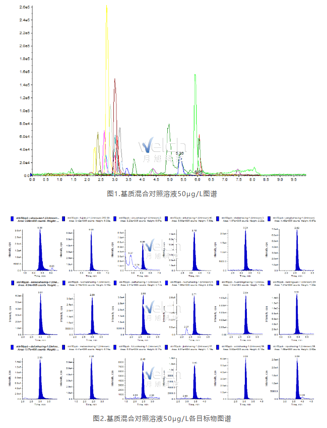 03、SPE凈化步驟● SPE柱:月旭Welchrom? BRP,規(guī)格:200mg/6mL。 活化:10mL甲醇、10mL水,棄去; 上樣:取備用液過柱,棄去; 淋洗:5mL水,抽干; 洗脫:4mL 5%甲酸甲醇、4mL乙酸乙酯洗脫,抽干并收集于離心管中; 復(fù)溶:將收集液體于40℃水浴氮?dú)獯抵两?,?0%乙腈甲酸溶液至1.0mL溶解殘余物,超聲1min,渦旋混勻(蜂王漿樣品溶液需在4℃下20000r/min離心10min),上清液過0.22μm濾膜,供液相色譜-串聯(lián)質(zhì)譜儀測(cè)定。